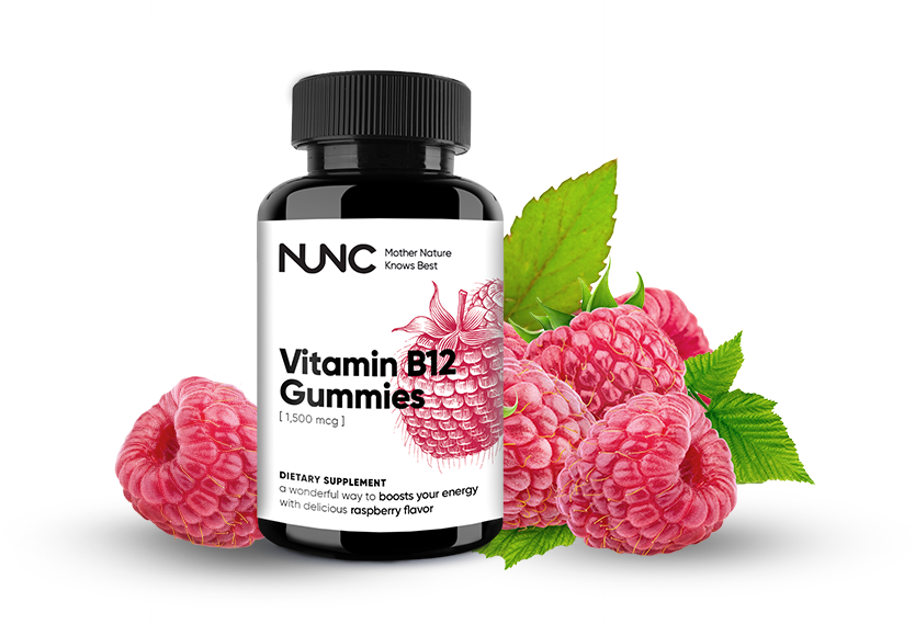 Worried about your bone strength and cognitive functions? Feeling down sometimes? Delicious NUNC Vitamin B12 gummies are the support you need: only the best quality vitamin B12 and flavored with real raspberries
