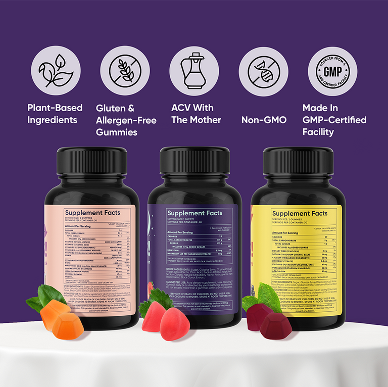 Healthy body needs the right nutrients, and we can help with that! Adding our gummies to your diet will literally change your life! We care about you and that’s why we created this yummy set that will enhance your diet and make you look and feel like you never did before. Whether you can’t sleep at night, getting lazy, losing focus, or simply want to improve your health, be sure — we got you covered!